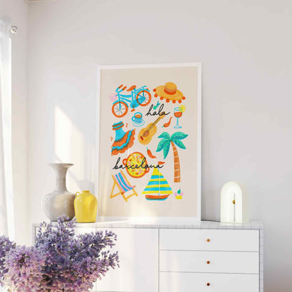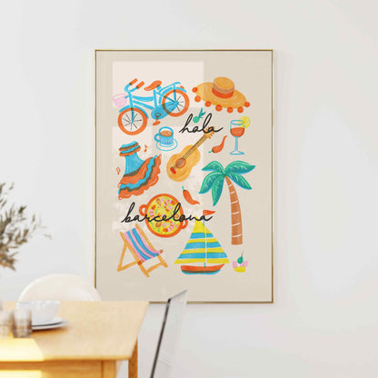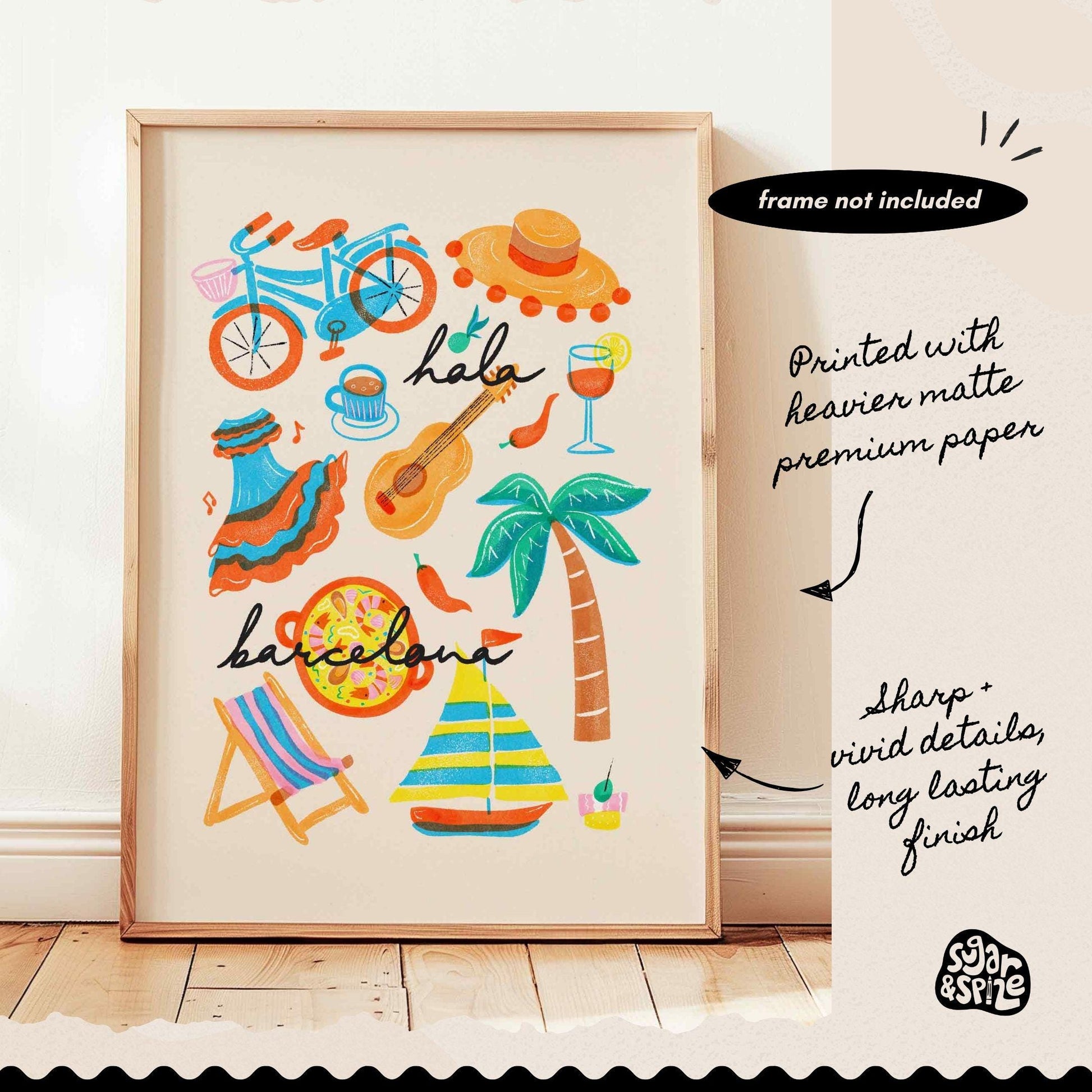 Barcelona Retro Print, Spain Food Travel Poster, Colorful Barcelona Wall Art, Cute Mediterranean Decor in hand drawn illustration makes the perfect decor to add a touch of funky, preppy & modern spice to your living room, bedroom or kids room walls.