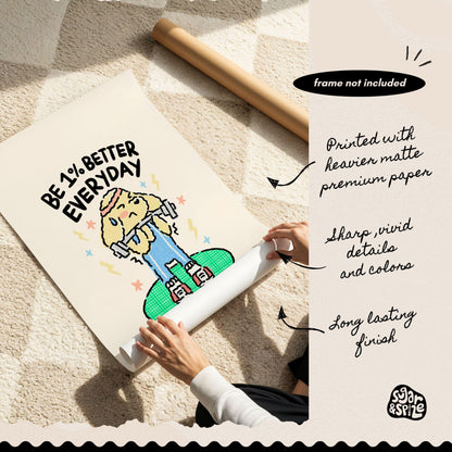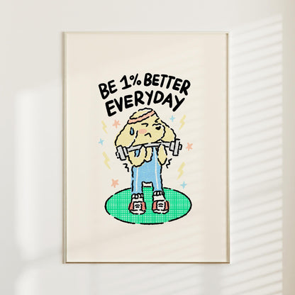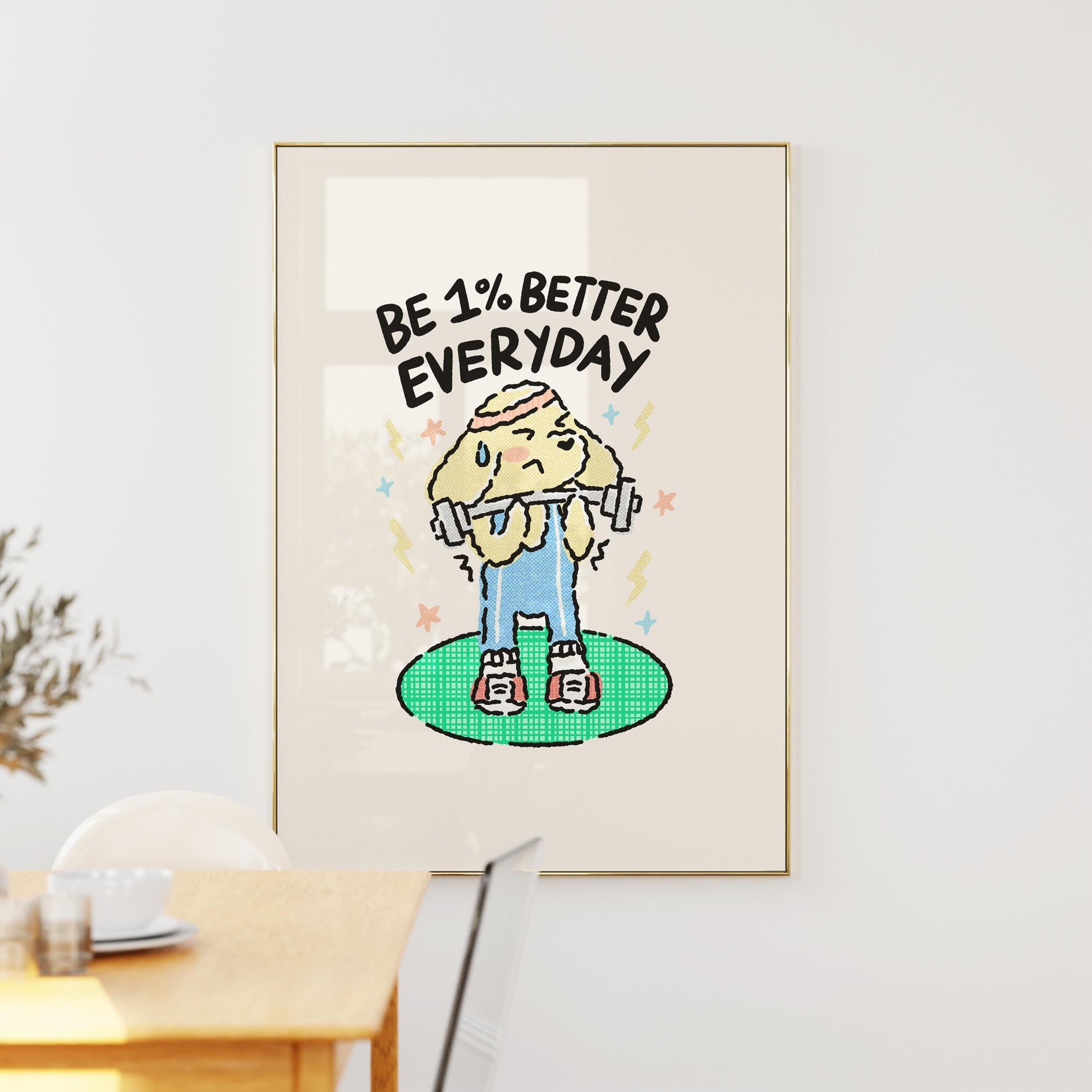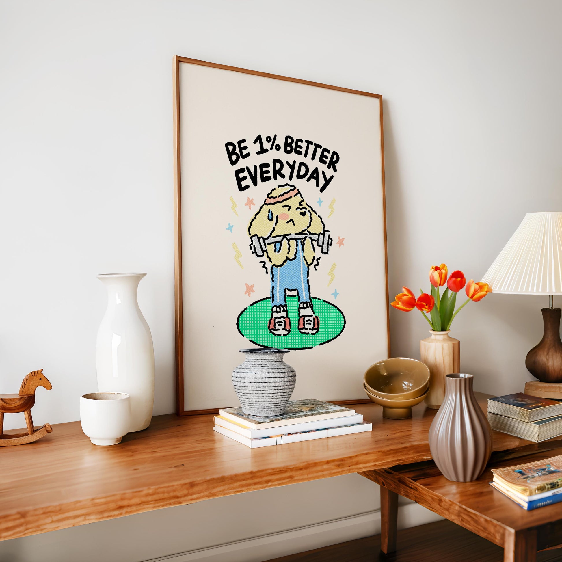 Be 1% Better Everyday Print, Positive Office Inspirational Poster, Kids Affirmations Decor, Cute Dog Wall Art in hand drawn illustration makes the perfect decor to add a touch of funky, eclectic & dopamine spice to your office desk, classroom or kids room walls.