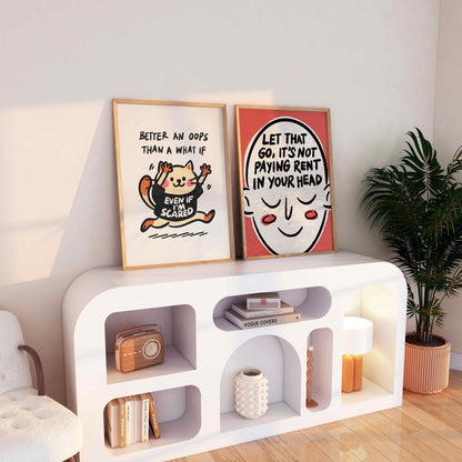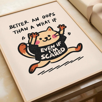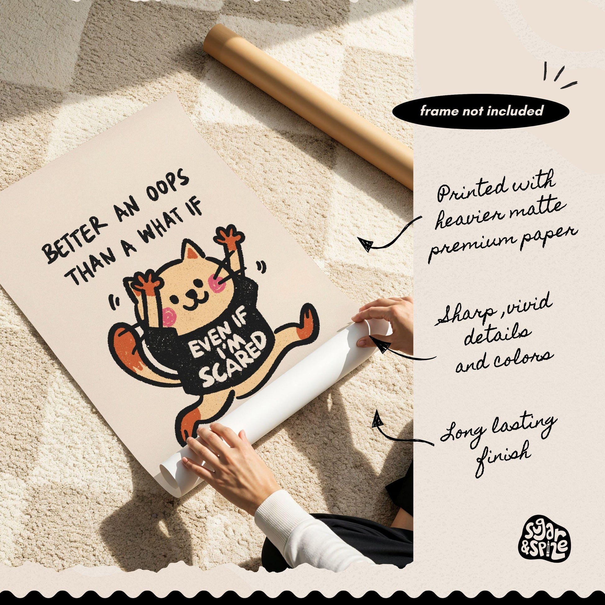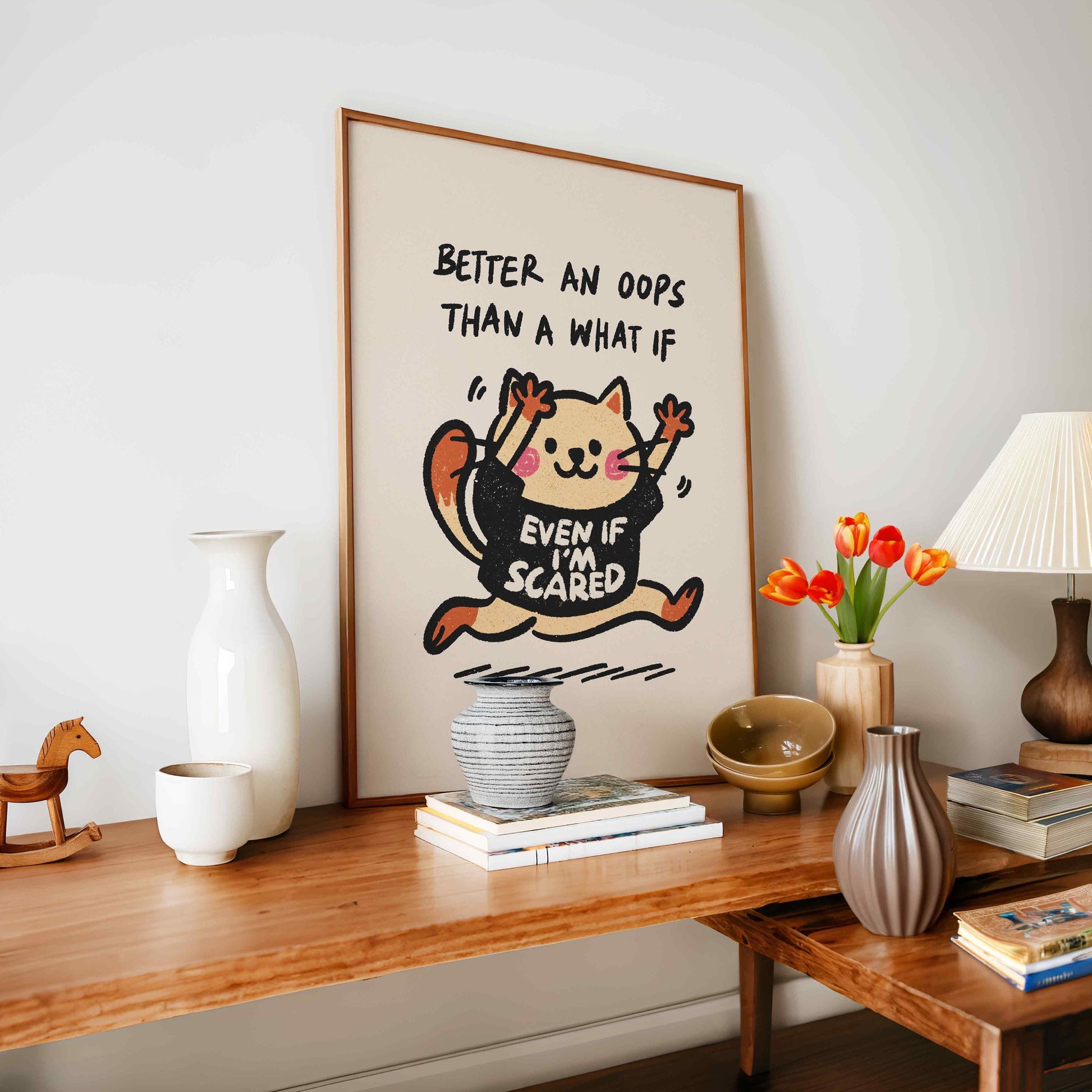 Better An Oops Than A What If Print, Retro Cat Cute Poster, Positive Mental Health Wall Art, Inspirational Aesthetic Wall Decor in hand drawn illustration makes the perfect decor to add a funky, eclectic & colorful touch to your living room, home office, or kids room walls.