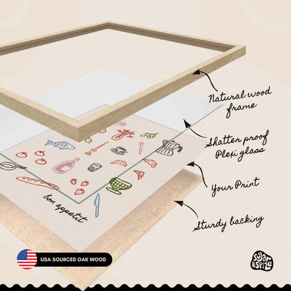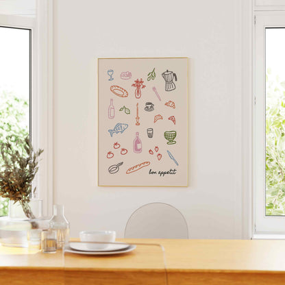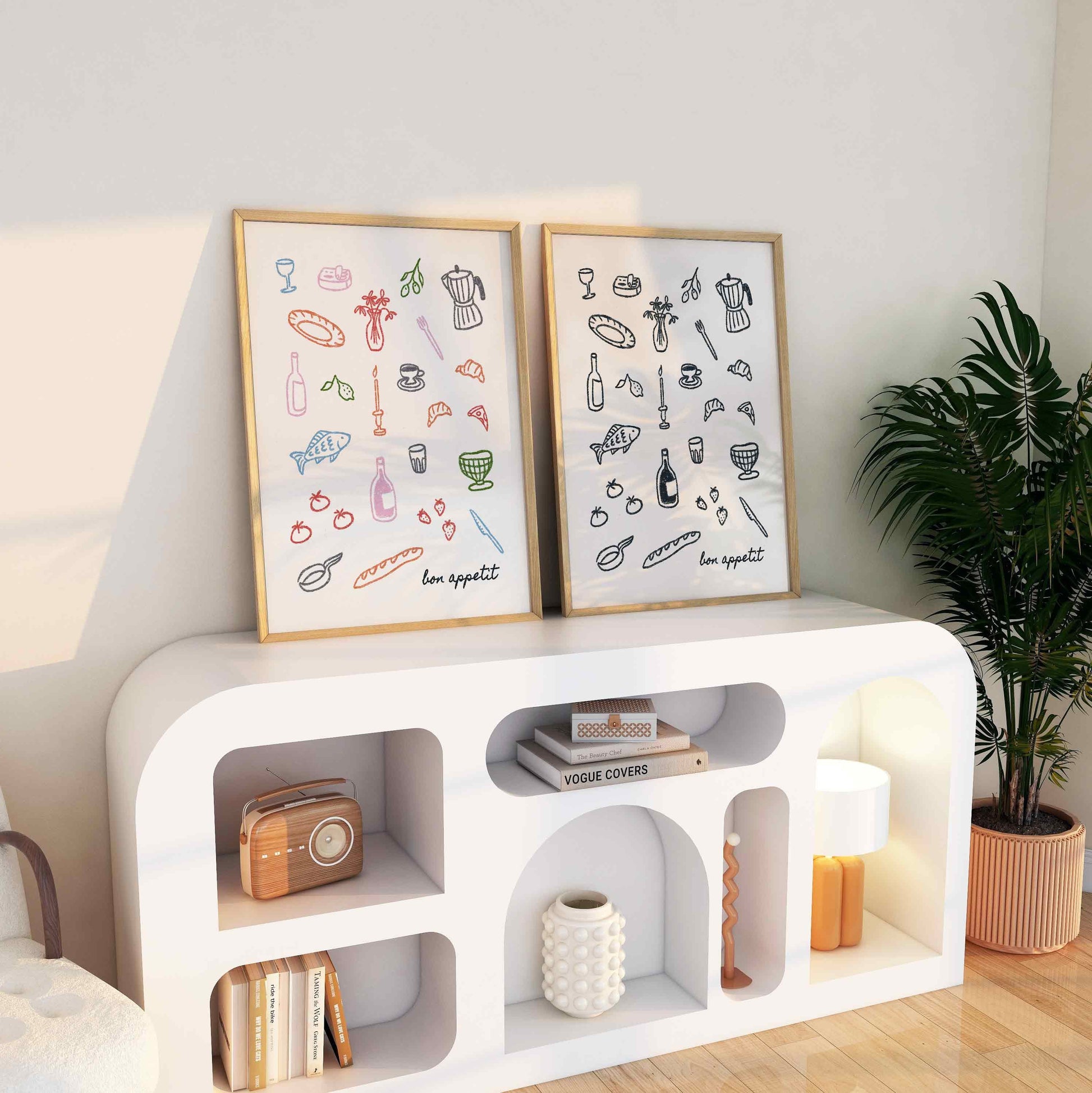 Bon Appetit Hand Drawn Print, French Food Sketch Art, Preppy Kitchen Wall Art, Dinner Party Poster, Kitchen Sayings, Dining Room Decor in hand drawn illustration makes the perfect kitchen poster to add a funky, eclectic & modern touch to your kitchen or dining walls.