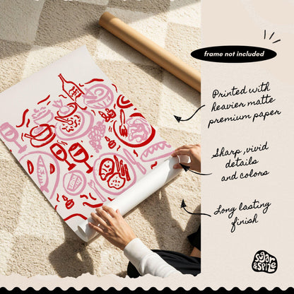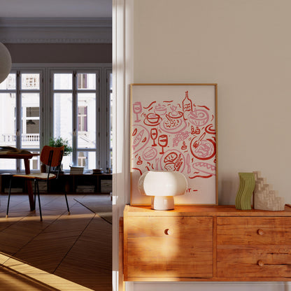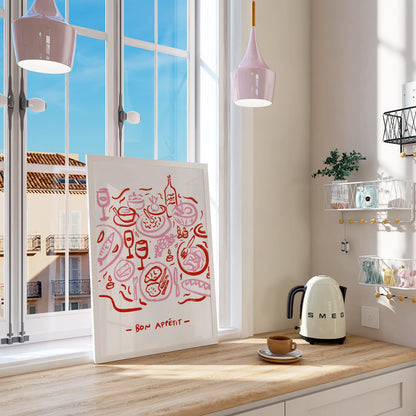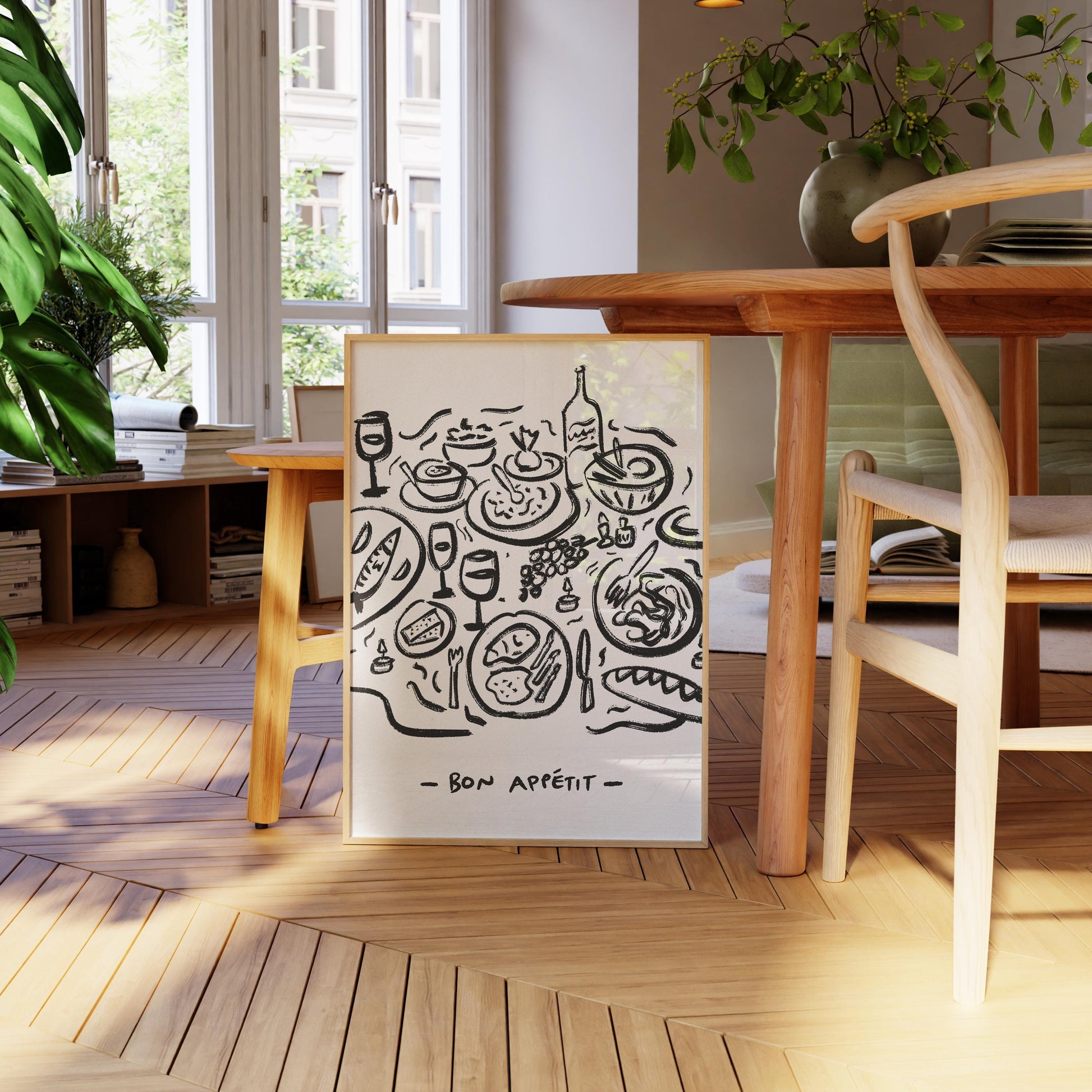 Bon Appetit Wall Art Print, Food Table Poster, French Kitchen Sketch Art, Girly Preppy Wall Decor, Hand Drawn Printable in hand drawn illustration makes the perfect kitchen poster to add a funky, eclectic & modern touch to your kitchen or dining walls.