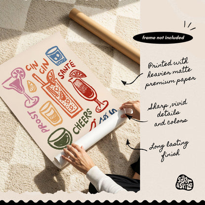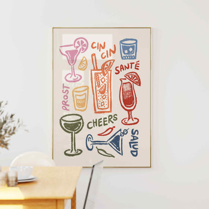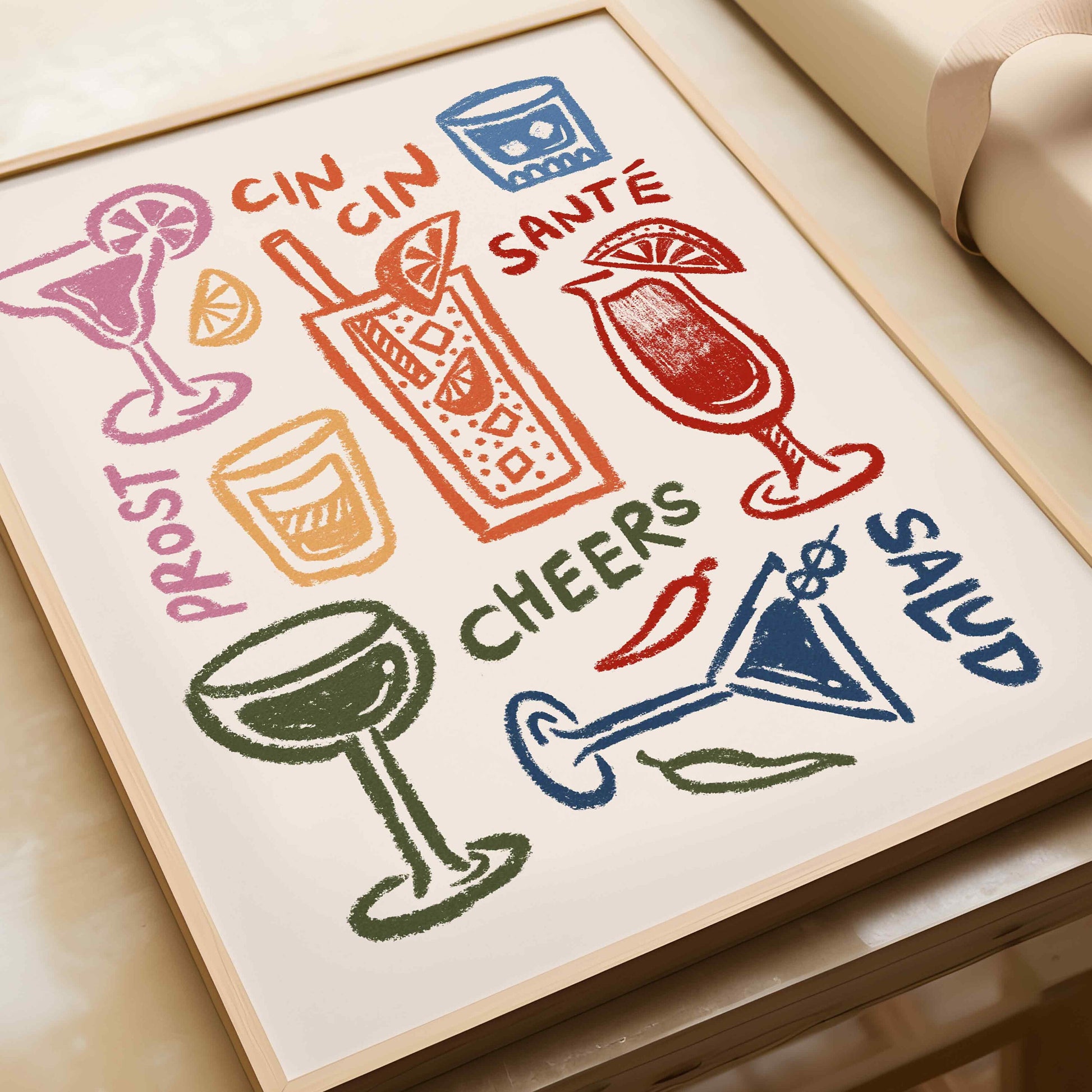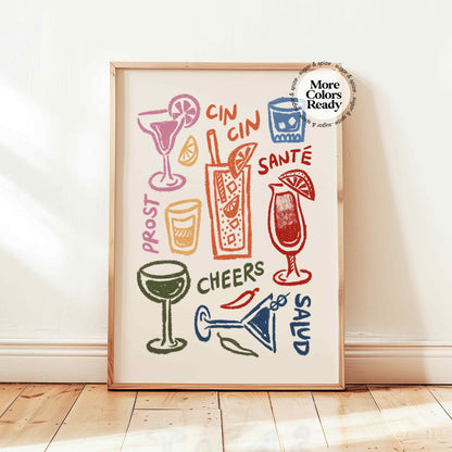 Cheers Glass Print, Colorful Retro Cocktail Poster, Wine Glasses Drink Wall Art, Funky Bar Cart Art, Vintage Drinks Sketch Art in hand drawn illustration makes the perfect kitchen poster to add a funky, eclectic & modern touch to your kitchen or dining walls.