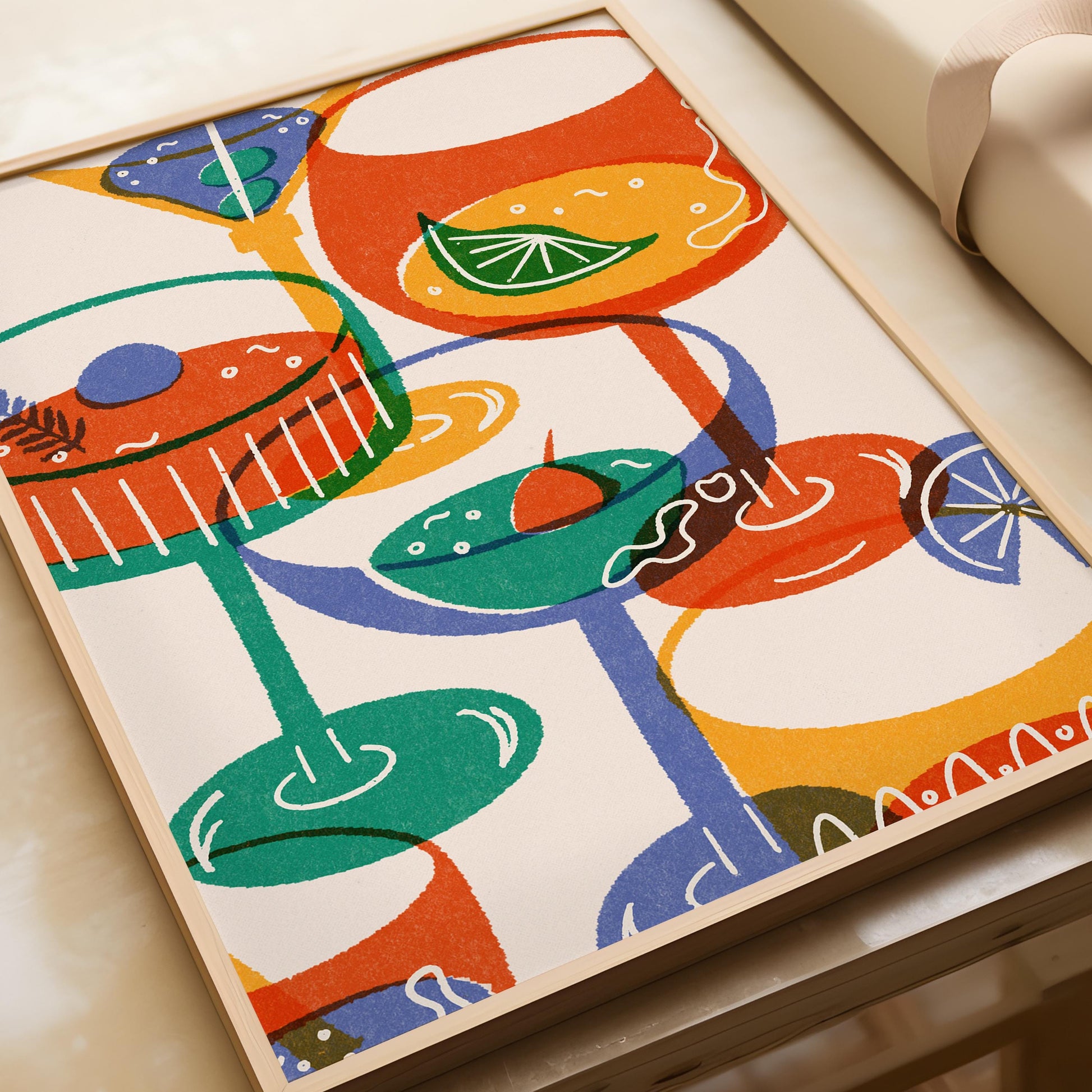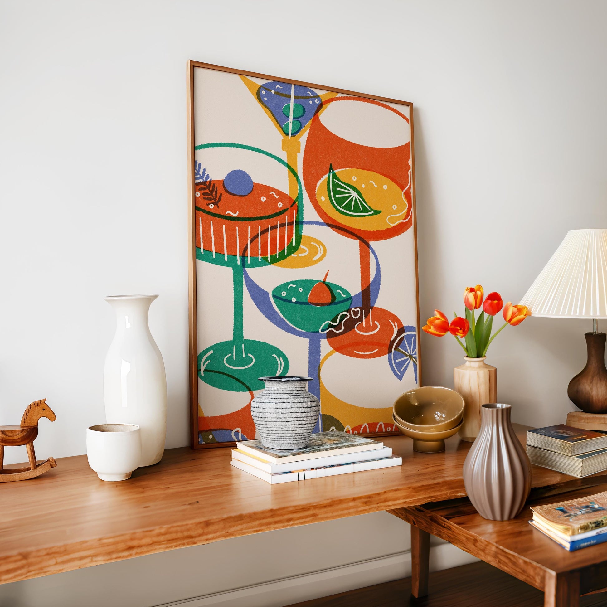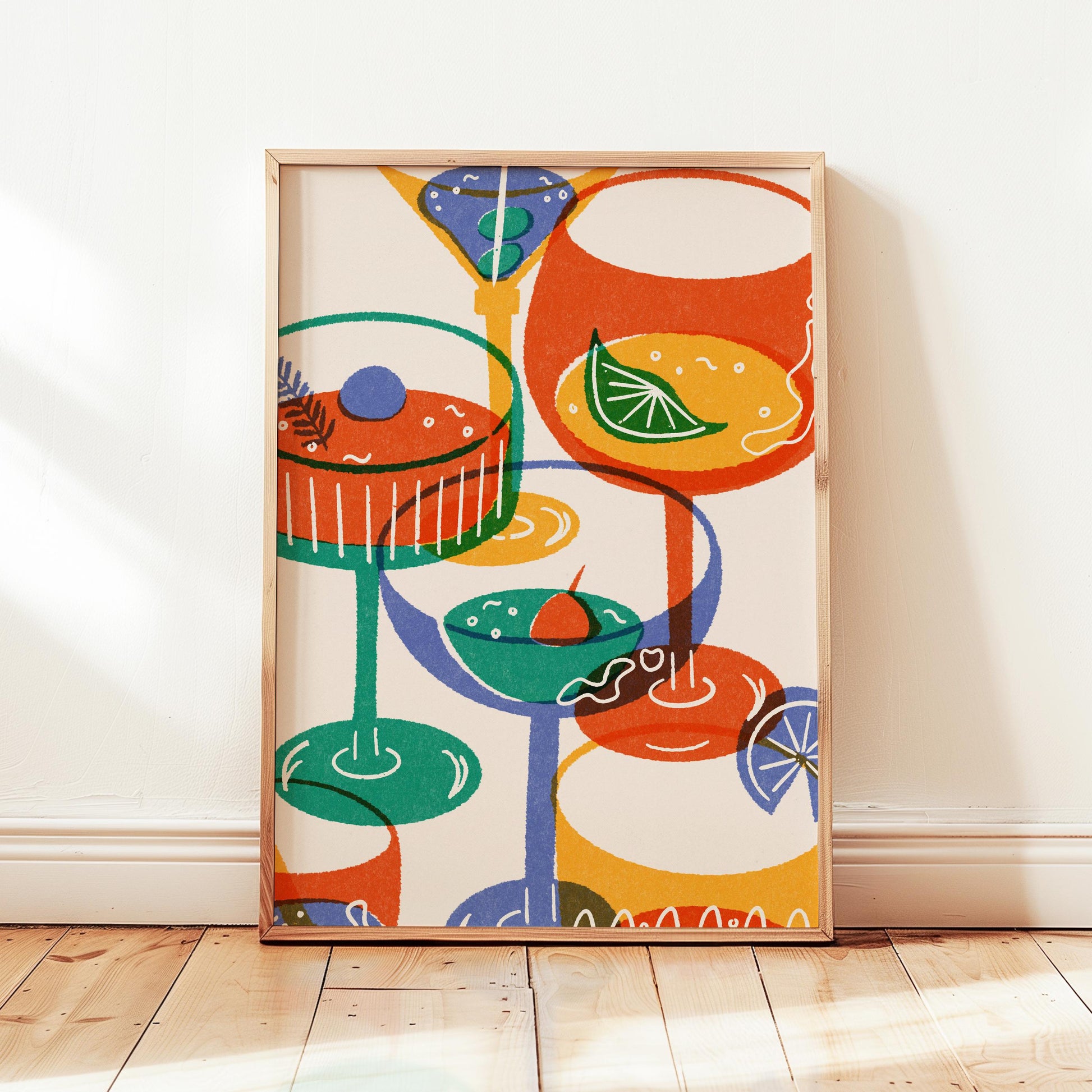 Cheers Drinks Print, Colorful Glasses Cocktail Poster, Funky Bar Cart Wall Art, Retro Modern Kitchen Decor in hand drawn illustration makes the perfect decor to add a funky, eclectic & modern touch to your kitchen or dining walls.