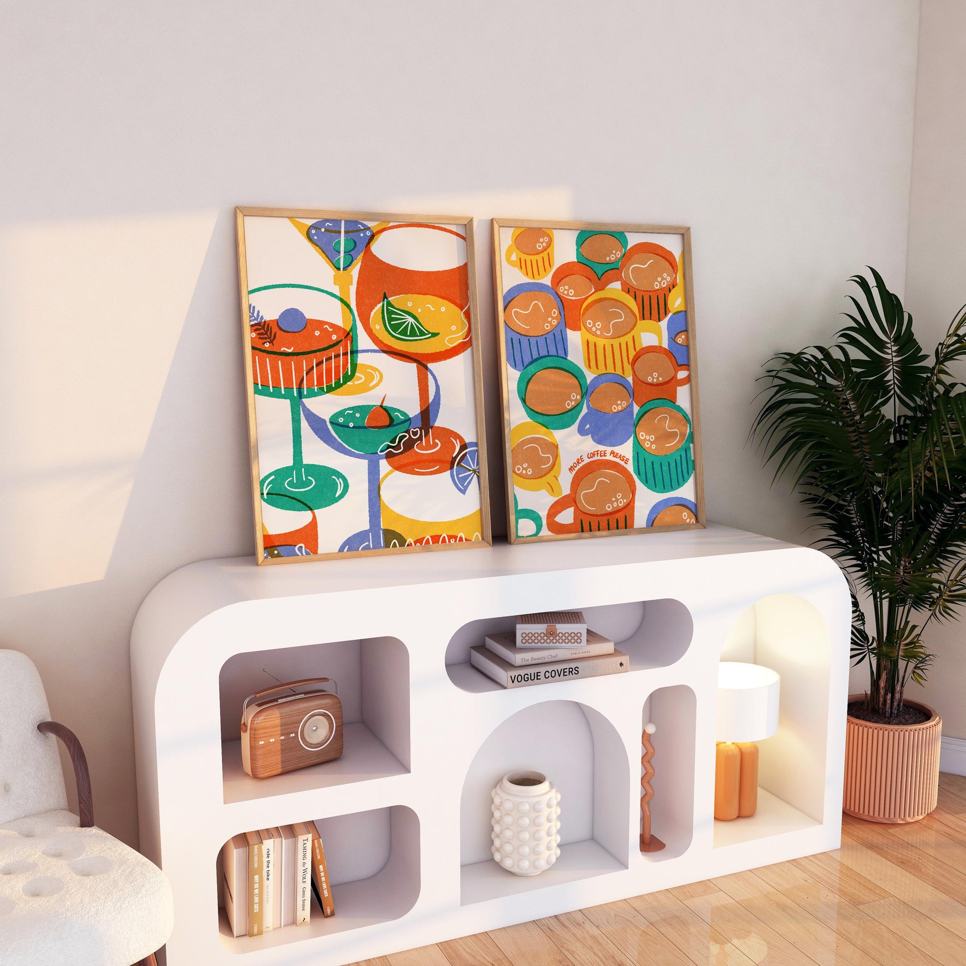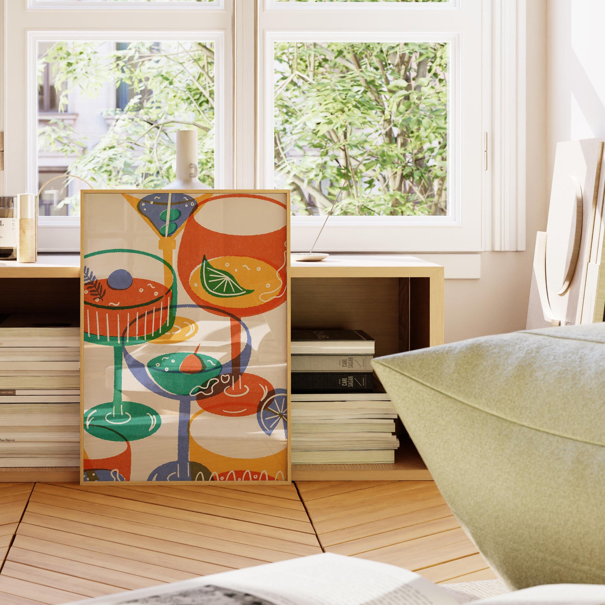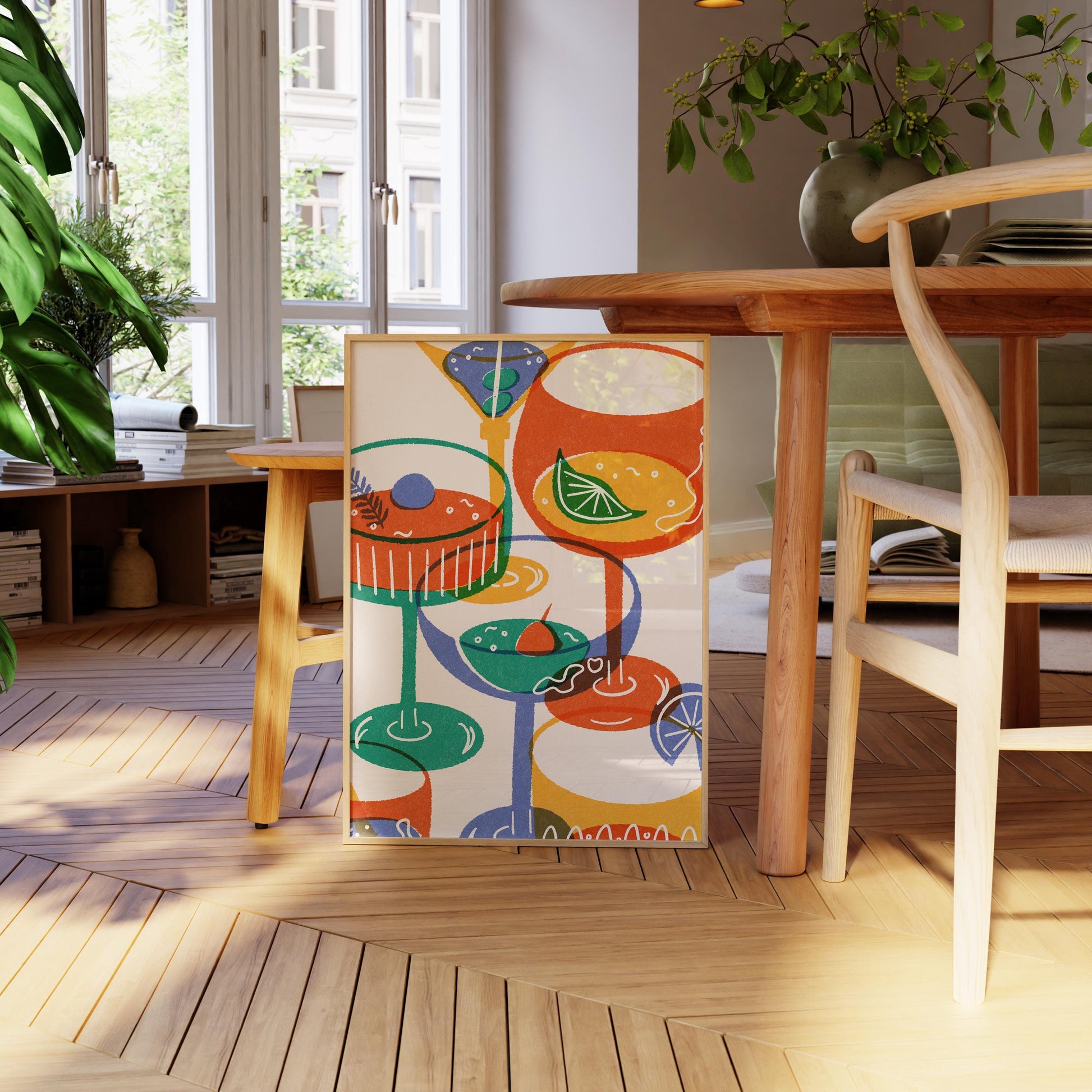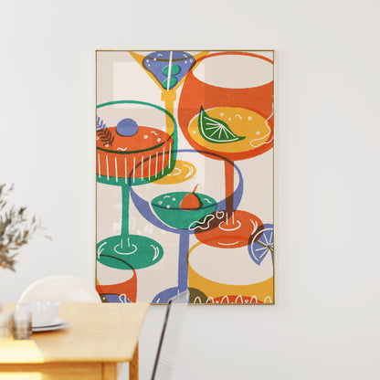 Cheers Drinks Print, Colorful Glasses Cocktail Poster, Funky Bar Cart Wall Art, Retro Modern Kitchen Decor in hand drawn illustration makes the perfect decor to add a funky, eclectic & modern touch to your kitchen or dining walls.
