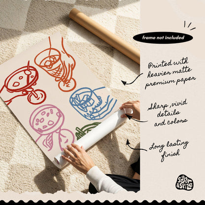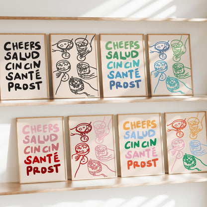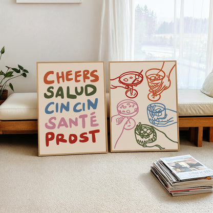 Cheers Print Set of 2, Colorful Cin Cin Posters, Funky Bar Cart Wall Art, Eclectic Kitchen Decor in hand drawn illustration makes the perfect decor to add a touch of funky, preppy & modern spice to your kitchen or dining room walls.