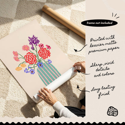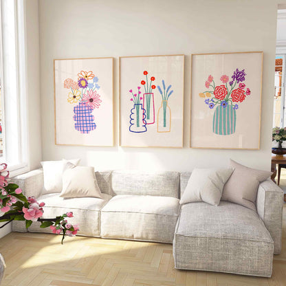 Flower Vase Print Set of 3, Floral Bouquet Pastel Poster, Abstract Boho Gallery Art, Flower Market Print, Coquette Wall Decor in hand drawn illustration makes the perfect poster to add a touch of funky, eclectic & dopamine spice to your living room or bedroom walls.
