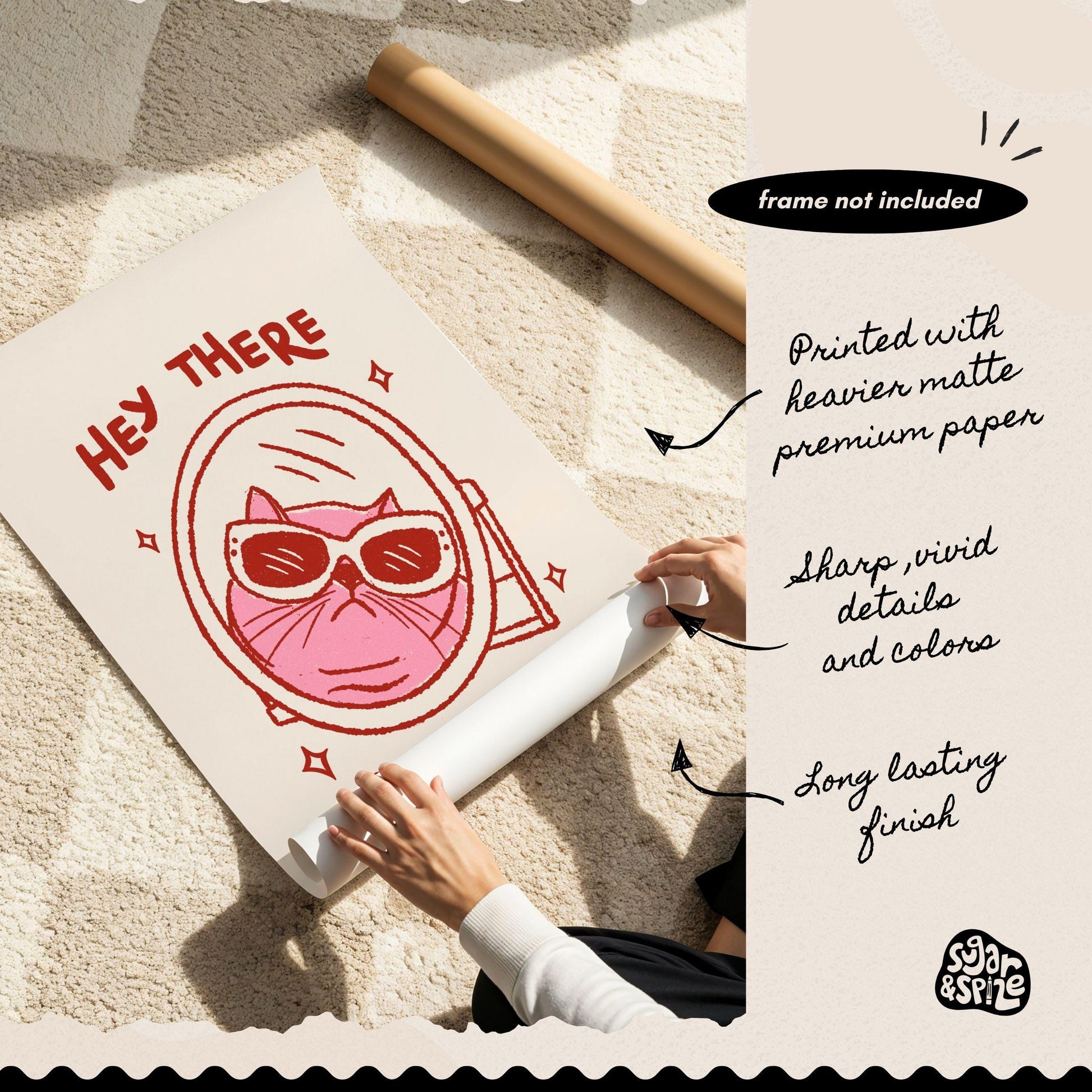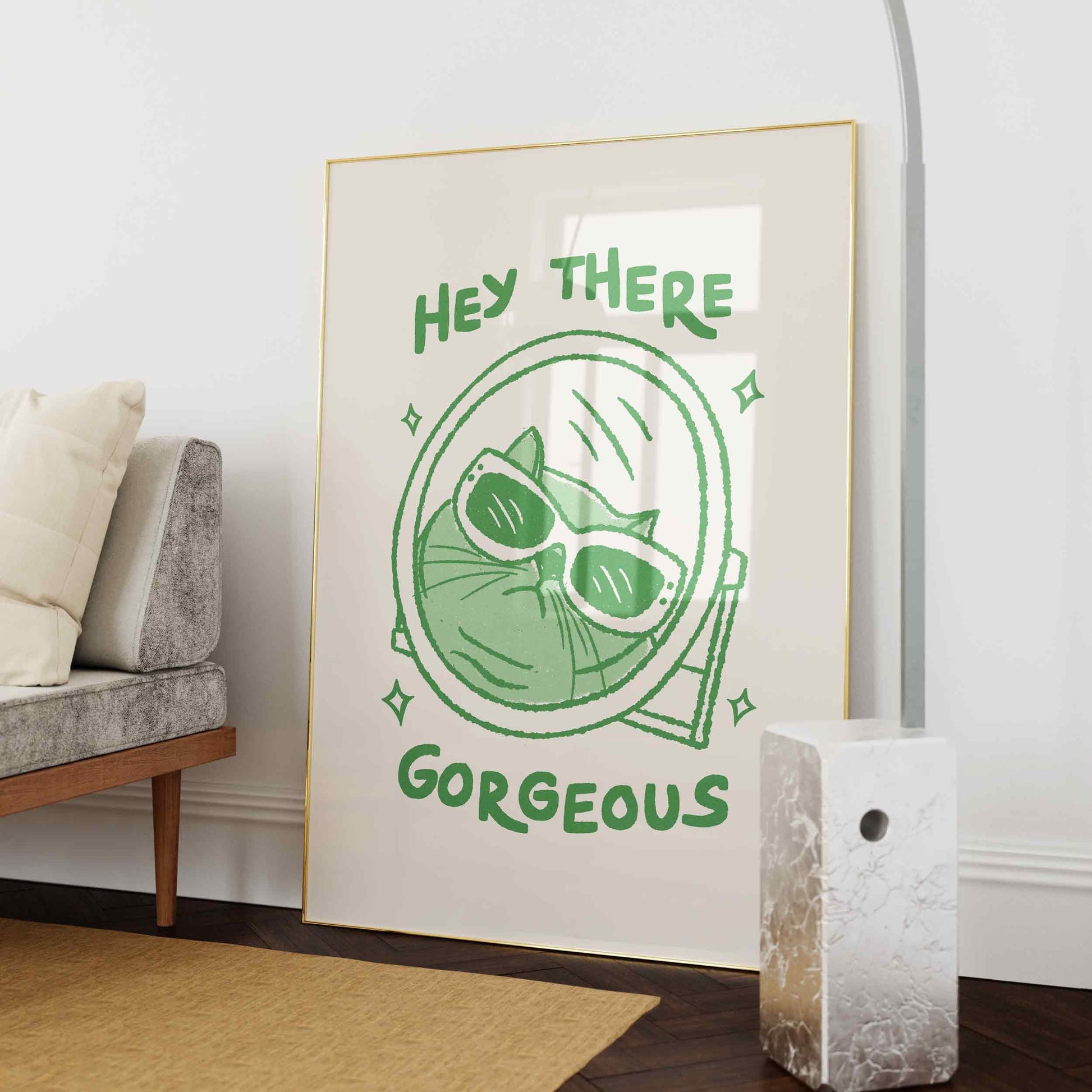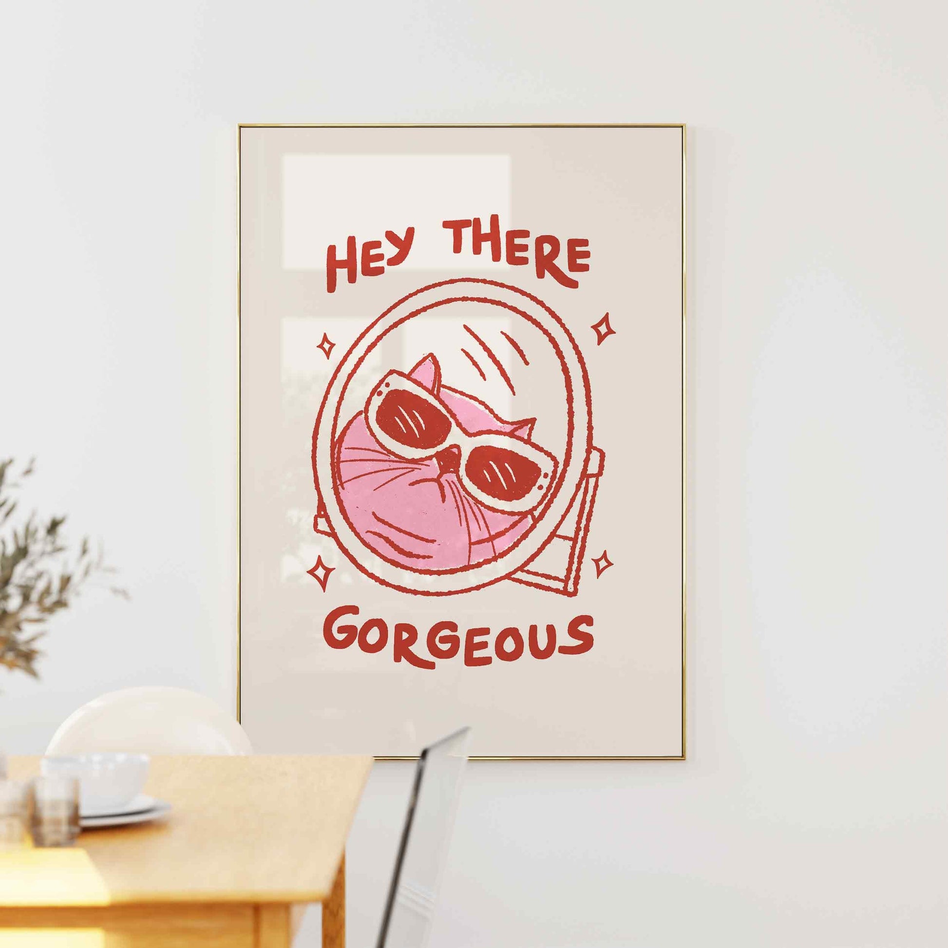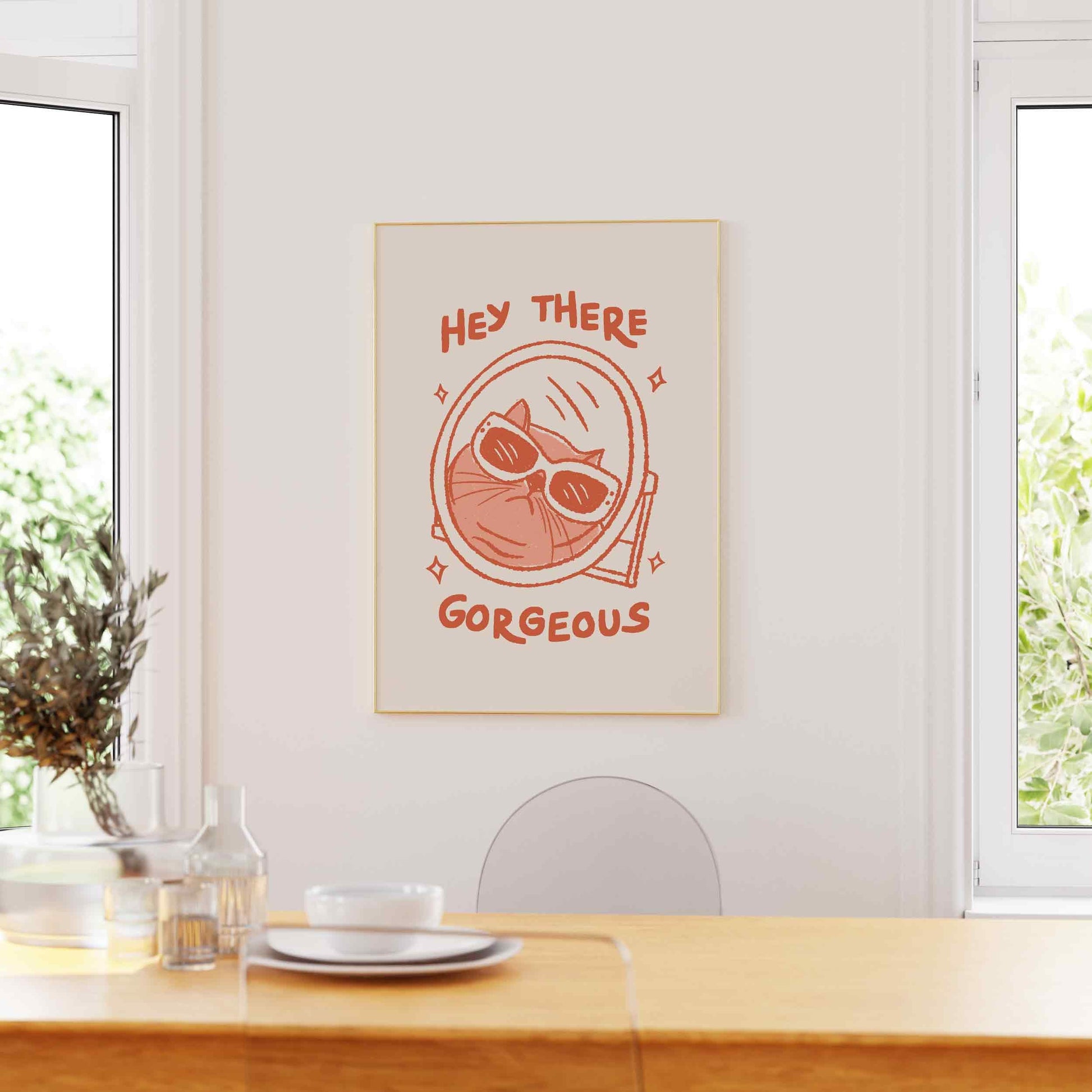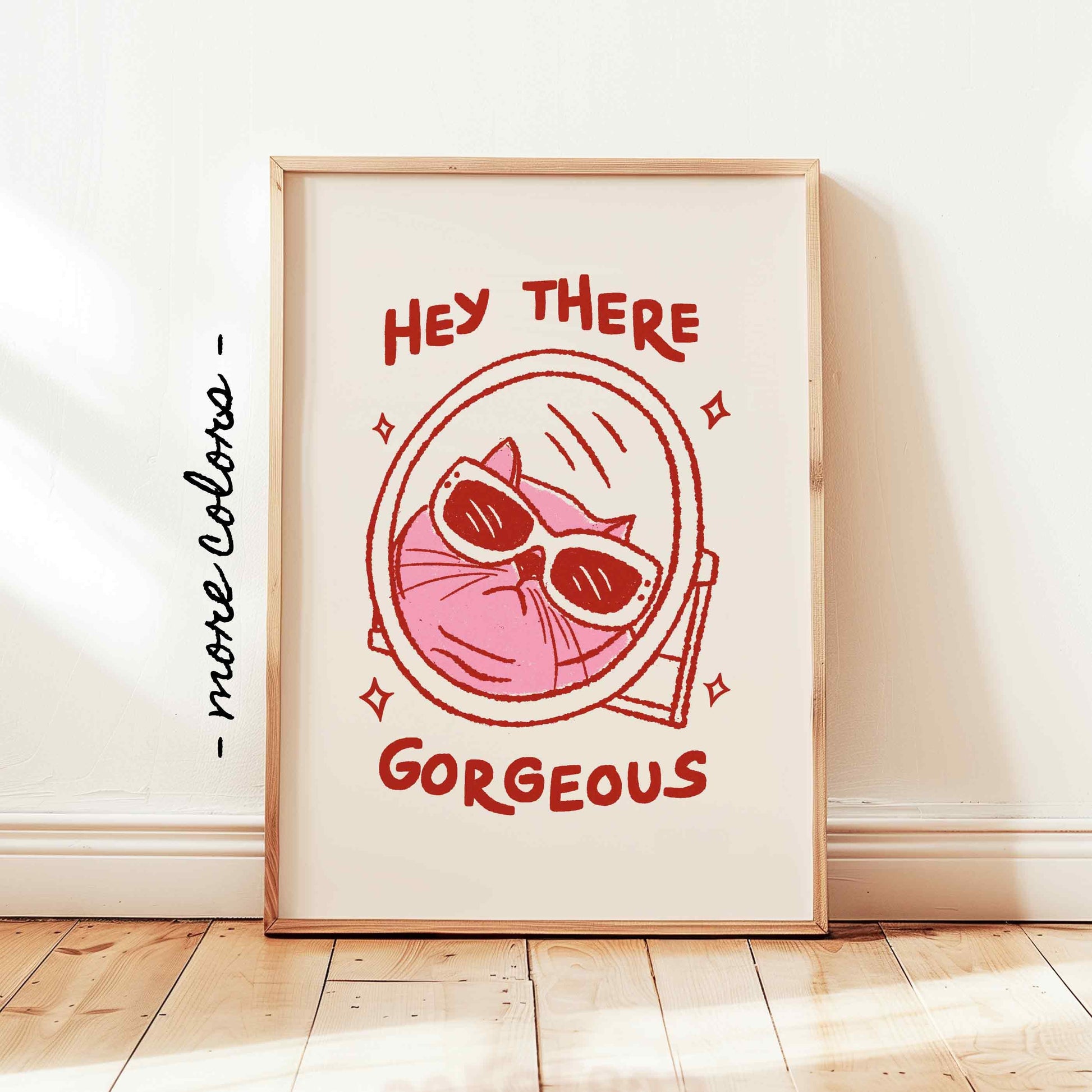 Hello Gorgeous Print, Funny Cat Poster, Red Pink Cat Wall Art, Positive Vibes Decor, Cat Lover Gift in hand drawn illustration makes the perfect decor to add a funky, eclectic & modern touch to your living room, bedroom or kids room walls.