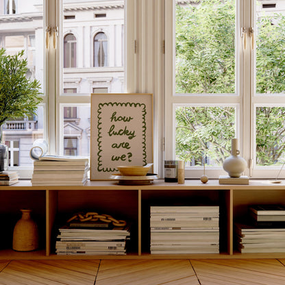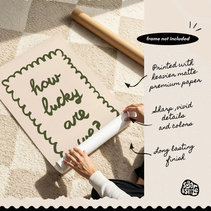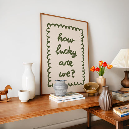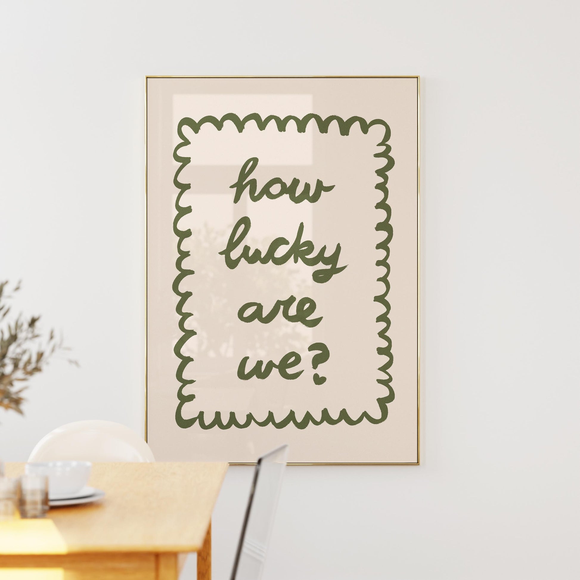 How Lucky Are We Print, Positive Affirmations Poster, Sage Green Trendy Wall Art, Minimalistic Aesthetic Decor in hand drawn illustration makes the perfect decor to add a touch of funky, eclectic & dopamine spice to your office desk, classroom or kids room walls.