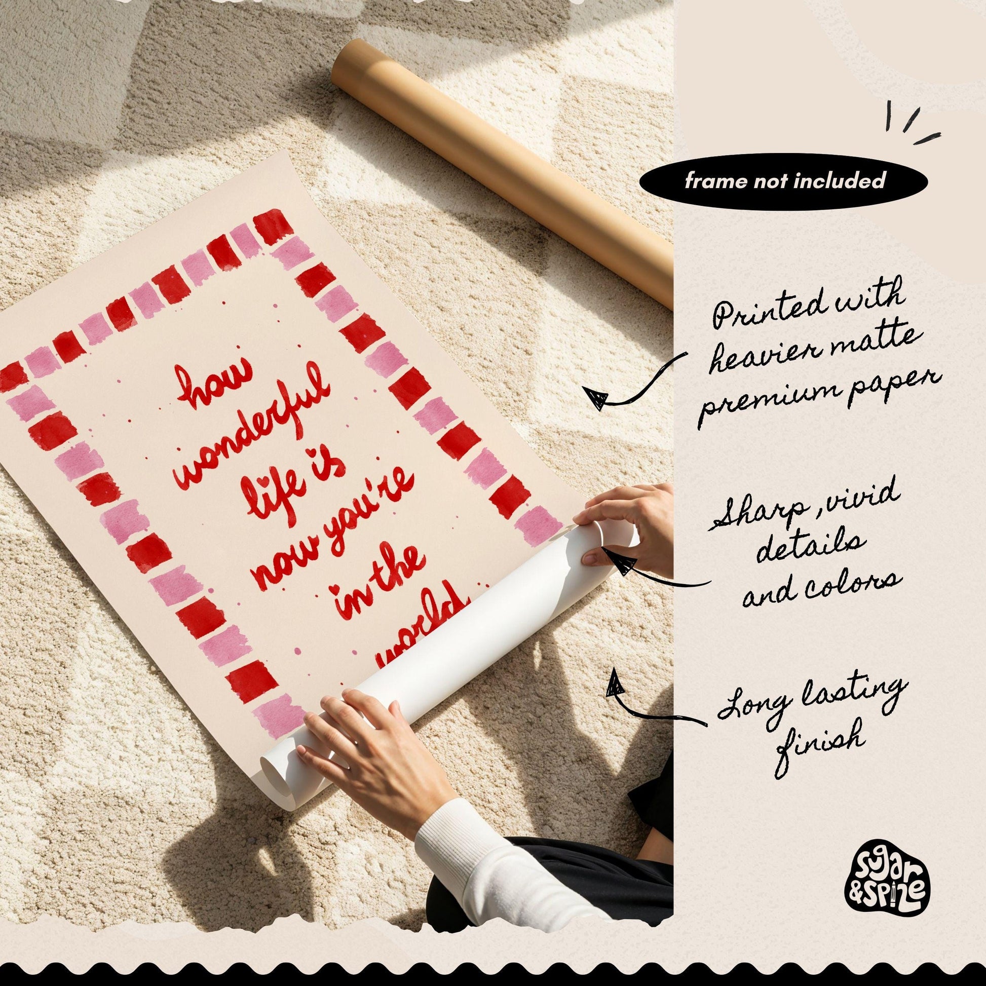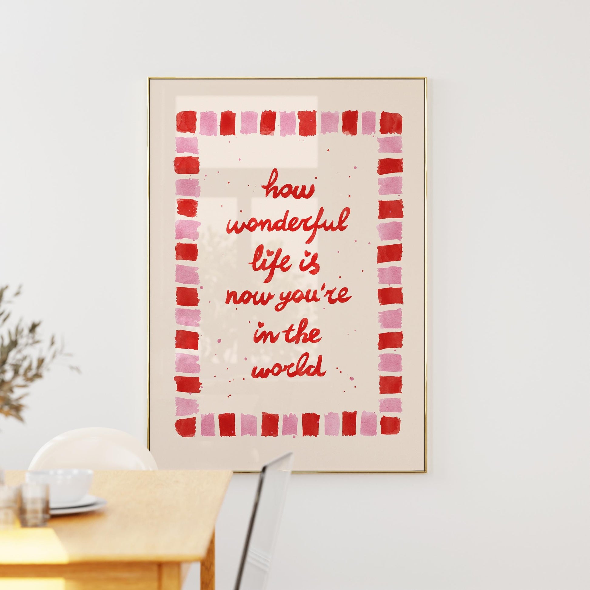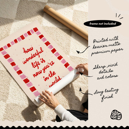How Wonderful Life Is Print, Red Pink Nursery Wall Art, Kids Watercolor Quote Print, Playroom Wall Art, Baby Gift Decor in hand drawn illustration makes the perfect decor to add a touch of funky, eclectic & dopamine spice to your office desk, classroom or kids room walls.