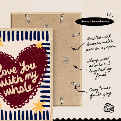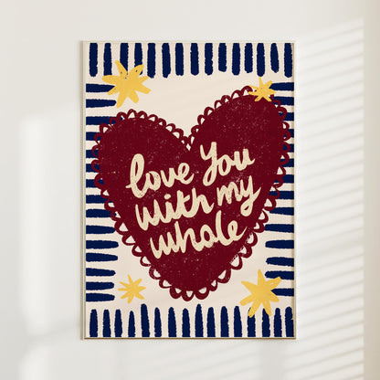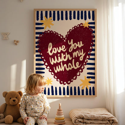 Love You With My Whole Heart Print, Boho Nursery Wall Art, Positive Affirmations Poster, Cute Trendy Playroom Decor in hand drawn illustration makes the perfect decor to add a funky, eclectic & modern touch to your office, classroom or kids room walls.