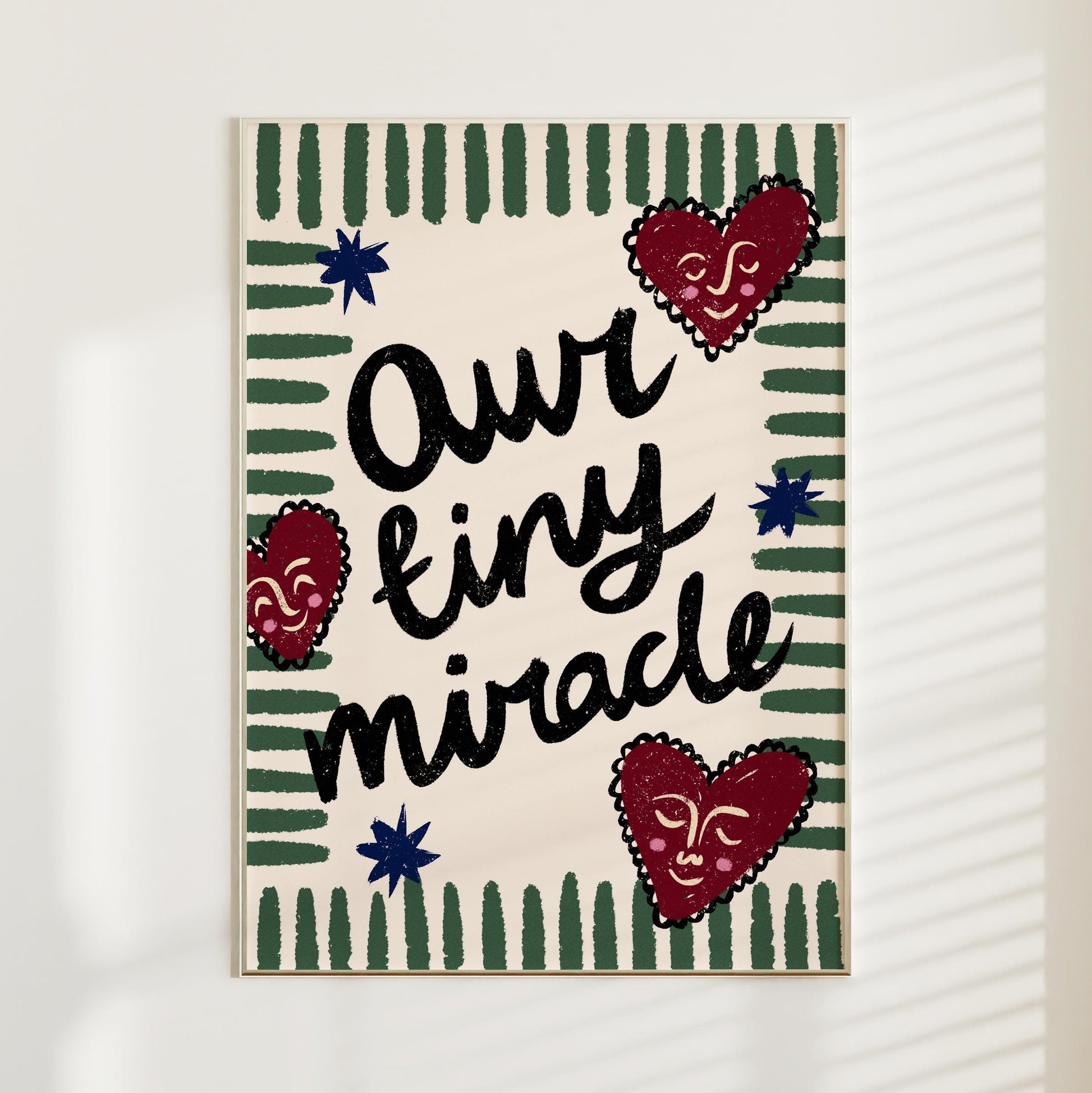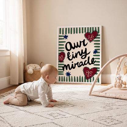 Our Tiny Miracle Print, Boho Nursery Wall Art, Positive Affirmations Poster, Cute Trendy Playroom Decor in hand drawn illustration makes the perfect decor to add a funky, eclectic & modern touch to your office, classroom or kids room walls.