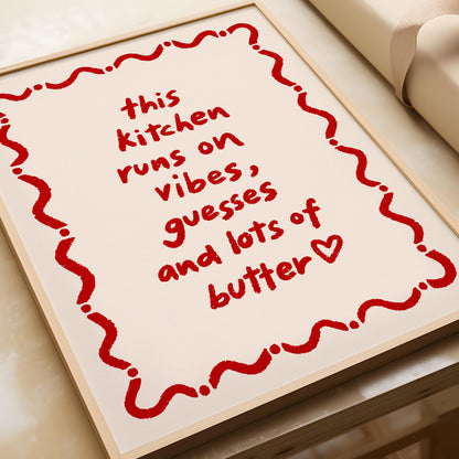 Retro Funny Kitchen Print, Wavy Stripes Heart Poster, This Kitchen Runs On Vibes Wall Art, Minimalist Girly Decor in hand drawn illustration makes the perfect poster to add a funky, eclectic & modern touch to your kitchen or dining walls.